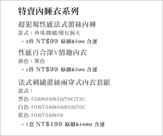 商品訊息簡述: 只要99元起(含運)即可購得原價最高1080元特賣內睡衣系列:(A)超犯規性感法式蕾絲內褲3件/(B)性感百合深V情趣?衣1件/(C)法式刺繡蕾絲兩穿式內衣套組1套。
